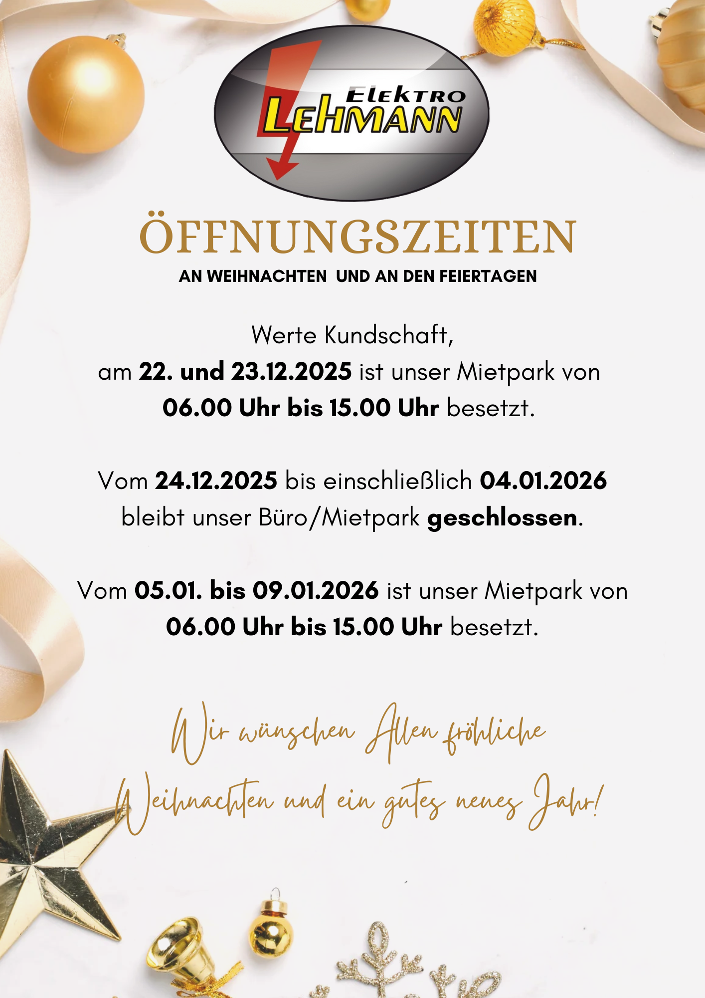 Am 22. und 23.12.2025 ist unser Mietpark von 06.00 Uhr bis 15.00 Uhr besetzt.